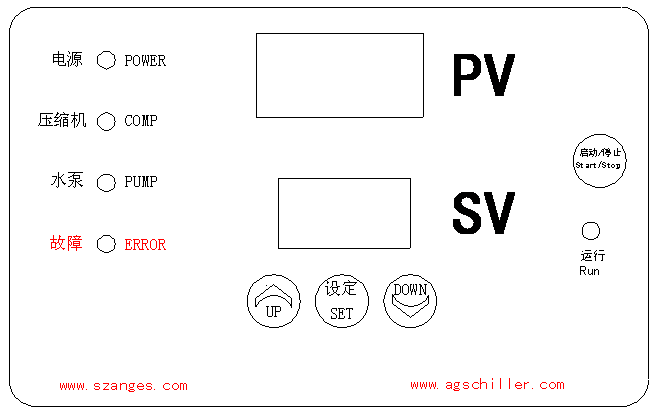 3、關機:按“ON/OFF” 啓停(ting)鍵關閉機器。如(ru)長時間不使用(yong)時,請關閉冷凍(dong)機電源并排掉(diao)水箱内或殼管(guǎn)式蒸發器内的(de)冷凍介質。
