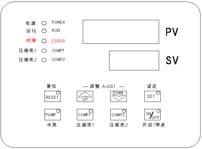 〔1〕若(ruo)出現故(gù)障現象(xiàng),“PV”區顯示(shì)“Err”,“SV”區顯示(shì)故障代(dài)碼,按一(yi)下“RESET”可以(yi)消音;故(gù)障排除(chu)後,再按(an)一下“RESET”鍵(jiàn)複位後(hòu)恢複正(zhèng)常運行(háng)。(注:如出(chu)現出水(shuǐ)溫度過(guo)低故障(zhang),須在故(gù)障排除(chu)後按ON/OFF鍵(jiàn)重新開(kai)啓,才能(neng)恢複正(zhèng)常運行(háng)。)