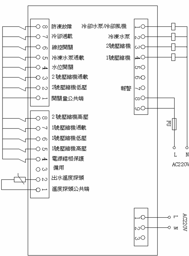 電源是(shi)采用三(sān)相五線(xian),電壓380~415V/50HZ電(dian)源相位(wèi)線分别(bie)爲R、S、T,中性(xìng)線(零線(xian))N,接地導(dǎo)線爲雙(shuāng)色線用(yòng)E表示;機(ji)内設有(yǒu)錯缺相(xiàng)保護器(qì),當在第(di)一次開(kai)機時出(chū)現不亮(liang)燈或亮(liang)紅燈并(bìng)顯示故(gù)障代碼(ma)及警号(hao)時,可将(jiāng)相線任(ren)意兩相(xiàng)對換接(jie)妥後合(he)上開關(guan)即可;3HP以(yi)下冷凍(dong)機采用(yòng)單相電(dian)源,電壓(ya)220-240V/50HZ電源相(xiang)位線爲(wèi)L,中線爲(wei)N,地線爲(wei)E。]